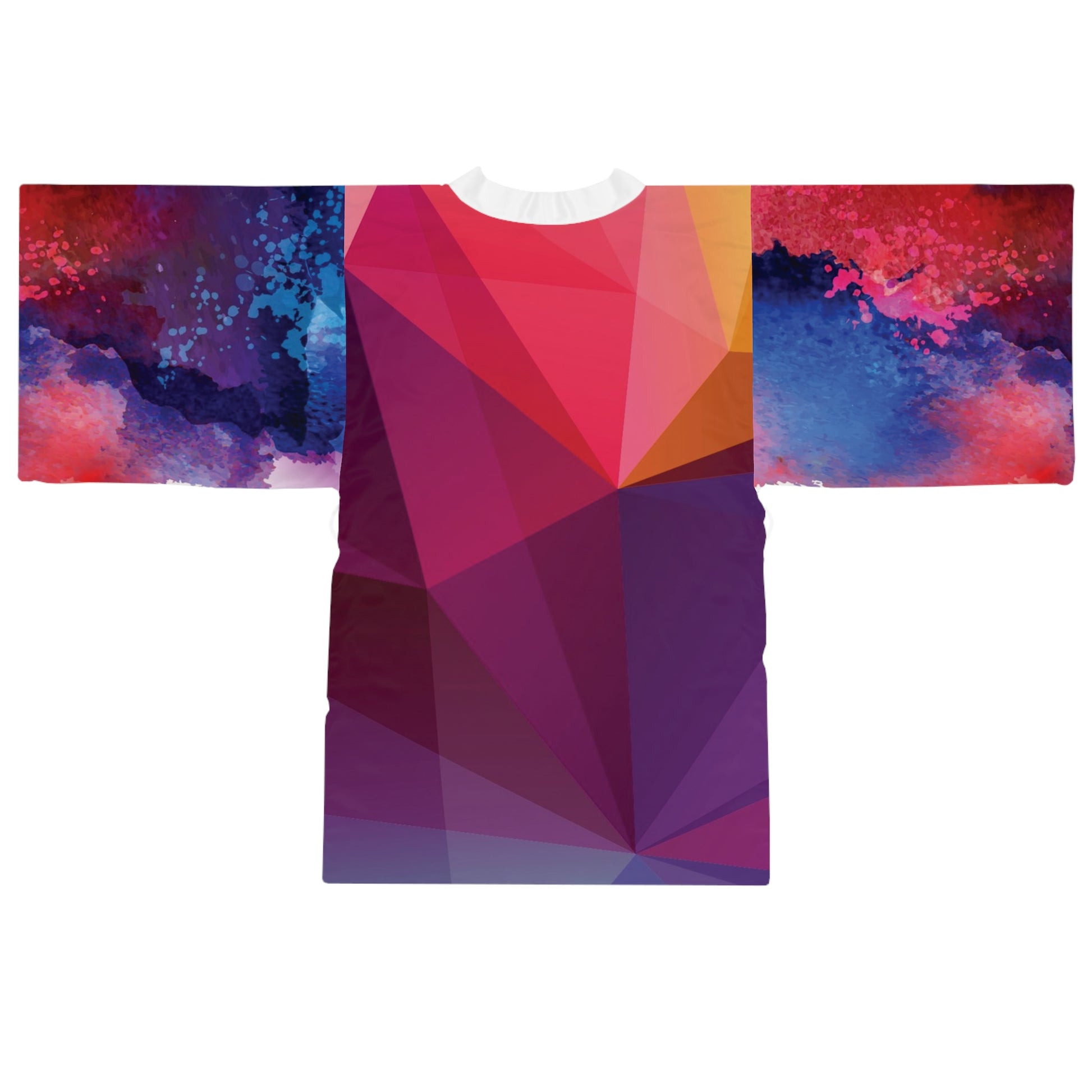 A flowing mid-length kimono robe that feels like a like a patriotic art piece you can wear. Lightweight and smooth, the fabric holds vibrant watercolor and geometric prints without losing shape, moving with you whether you’re lounging at home or stepping out to a creative evening. The wide bell sleeves and belted waist create an elegant silhouette that flatters a range of figures. Choose a black or white trim and belt to ground the dramatic color play—this robe brings painterly drama to quiet mornings, studio breaks, gallery nights, and relaxed gatherings.